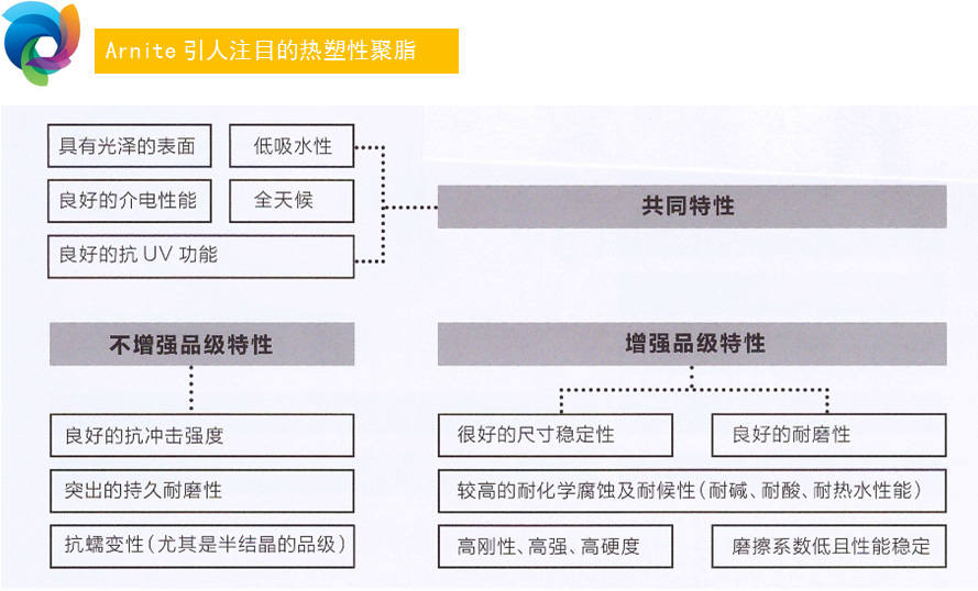 Arnite是DSM工程塑料公司熱塑性聚酯的產(chǎn)品名。Arnite A和D是以對(duì)聚對(duì)苯二甲酸丁乙二醇酯(PET)為基礎(chǔ)的,而Arnite T是以聚苯二甲酸丁二醇酯(PBT)為基礎(chǔ)的。Arnite產(chǎn)品有各種品級(jí):玻纖增強(qiáng)、礦粉增強(qiáng)和混合增加,同時(shí)又分為注塑品級(jí)和擠出品級(jí)。他們特別適合那些精密注塑產(chǎn)品。此外,我們還生產(chǎn)各種UL公司認(rèn)可的阻燃品級(jí)。該產(chǎn)品的主要優(yōu)點(diǎn)是:低吸水性、高尺寸穩(wěn)定性、良好表面光澤、極好的介電性能以及耐濕耐化學(xué)腐蝕性能,其中增加品級(jí)還提供了很好的強(qiáng)度。